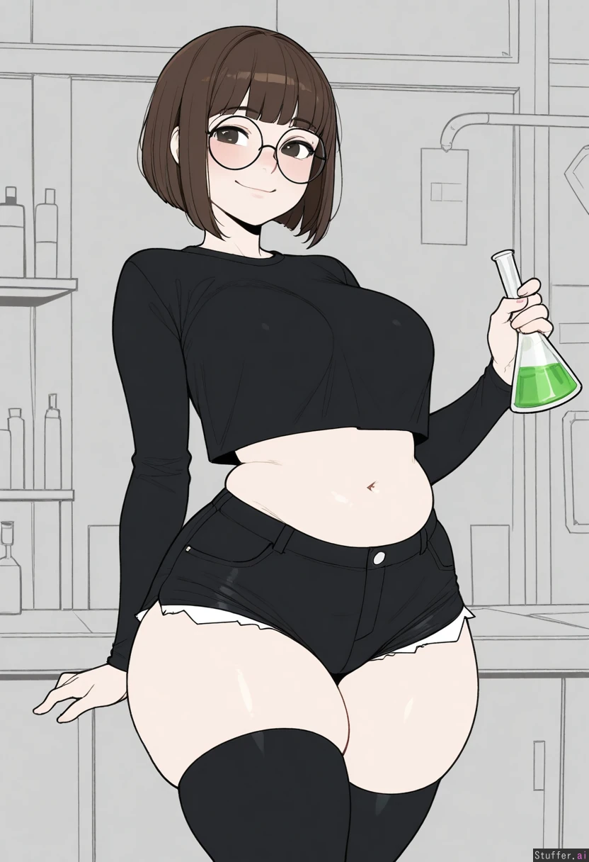 Solo, Krekkov (artist), KAMII MOMORU(artist), ((Flat colors)), perfect proportions, (straight hair hair, brown hair, messy bob haircut), dark eyes, cute face, large cute eyes, pale skin, cute pose, (((round glasses, (loose black cropped shirt), oversised cropped black shirt, long sleeves, black jean shorts, black thigh highs))), (manga style drawing, (monochrome)), walking in a science lab, lab background, chemicals in the background,(Erlenmeyer Flask Glass with green liquid in it in her hand), medium breasts, ((Skinny)), large muffin top (blushing, cute smile), fat, (thick thighs, fat thighs, bulging thighs, wide hips:1.2), (bigger breasts:1.1), (bigger belly:1.0)