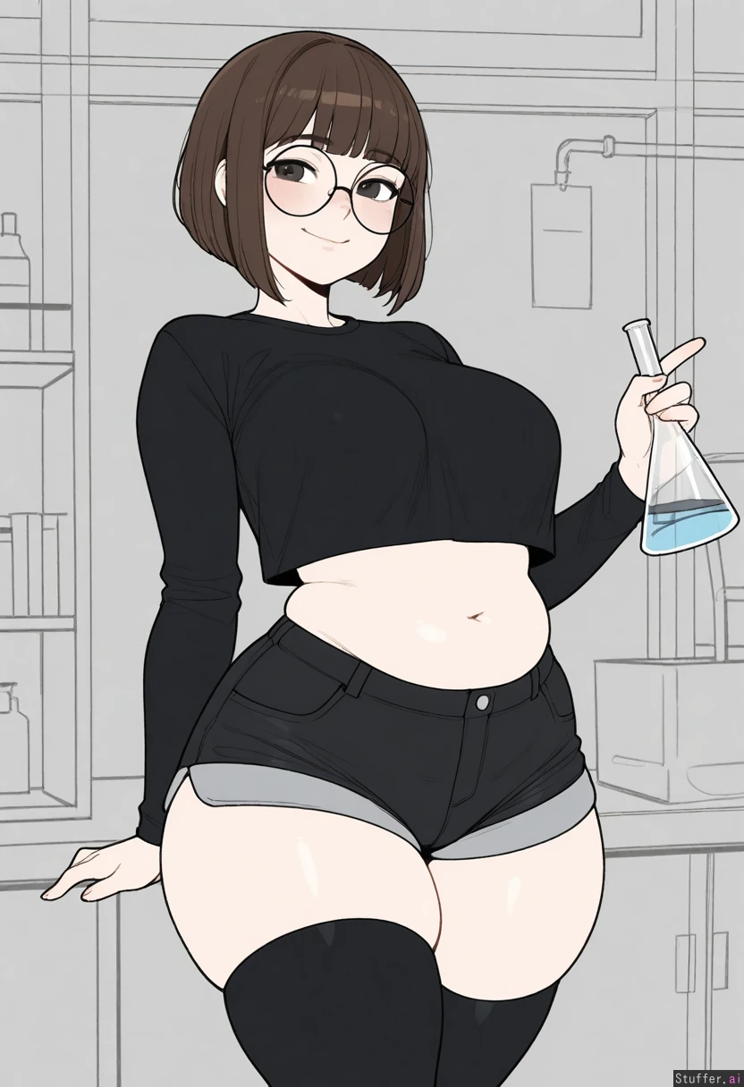 Solo, Krekkov (artist), KAMII MOMORU(artist), ((Flat colors)), perfect proportions, (straight hair hair, brown hair, messy bob haircut), dark eyes, cute face, large cute eyes, pale skin, cute pose, (((round glasses, (loose black cropped shirt), oversised cropped black shirt, long sleeves, black jean shorts, black thigh highs))), (manga style drawing, (monochrome)), walking in a science lab, lab background, chemicals in the background, (empty Erlenmeyer Flask Glass in her hand), medium breasts, ((Skinny)), large muffin top (blushing, cute smile), fat, (thick thighs, fat thighs, bulging thighs, wide hips:1.2), (bigger breasts:1.1), (bigger belly:1.0)