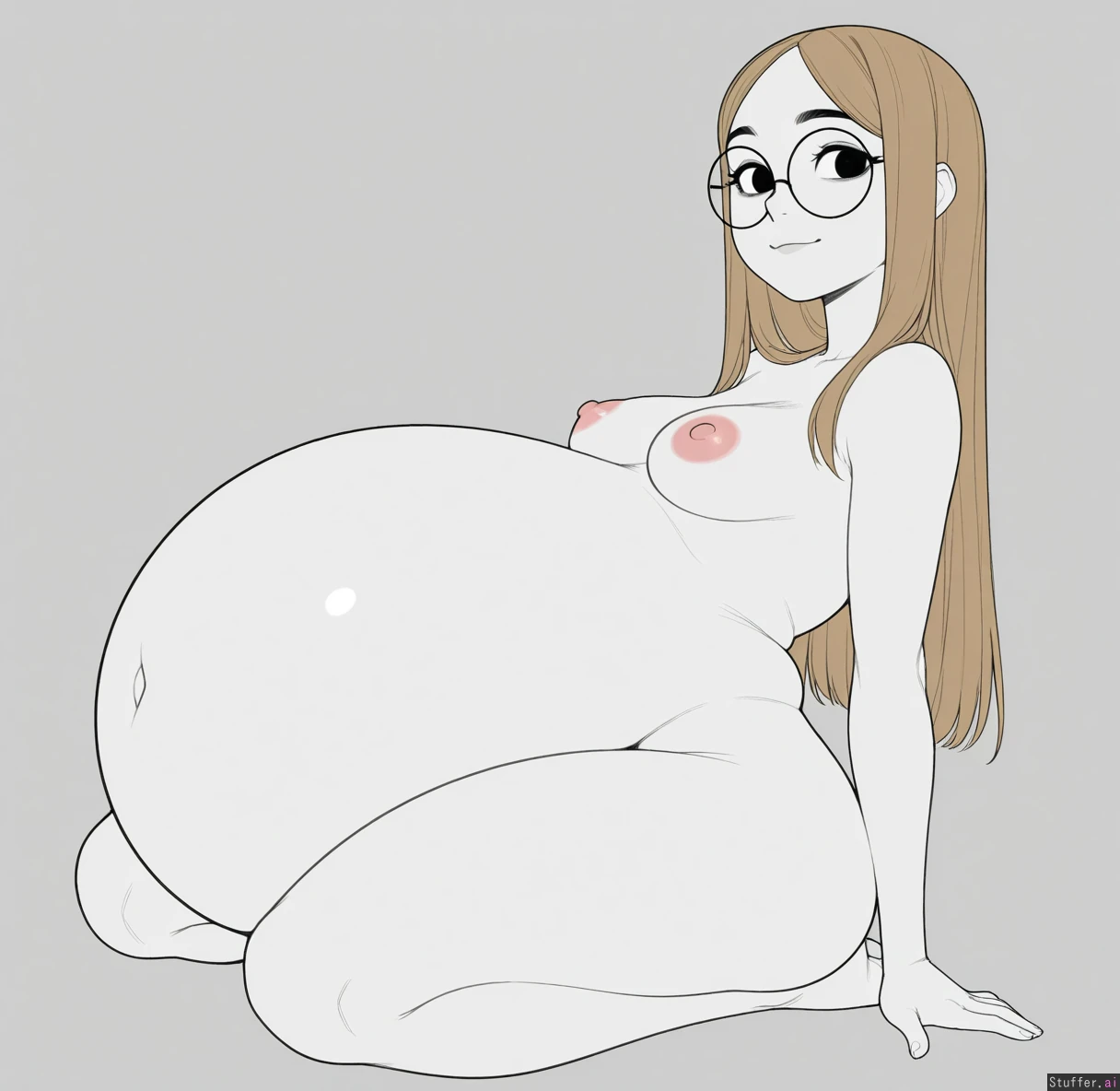 Solo, Krekkov (artist), KAMII MOMORU(artist), ((((Flat colors)))), perfect proportions, (straight hair hair, light brown hair, no bangs), dark eyes, cute face, large cute eyes, ((pale skin)), cute pose, (((round glasses, naked, pink nipples))), (manga style drawing, ((monochrome))), (side view), full body, (((small head))), (zoomed out), (absolutely massive belly, giant belly, gargantuine belly, super massive belly, round belly, enormous belly, biggest belly ever)
