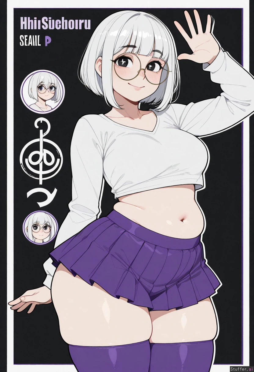 Solo, Krekkov (artist), KAMII MOMORU(artist), (((Flat colors))), perfect proportions, (straight hair hair, white hair, messy bob haircut), dark eyes, cute face, large cute eyes, pale skin, cute pose, (((round glasses, (white cropped shirt), oversised cropped white shirt, long sleeves, purple mini skirt, purple thigh highs))), (manga style drawing, (monochrome)), character select screen, black background, thin gold frame, video game, cute pose, sexy pose, medium breasts, ((Skinny)), large muffin top (blushing, cute smile, wide eyes, stars in her eyes, waving, saying hi), fat, (thick thighs, fat thighs, bulging thighs, wide hips:1.2), (bigger breasts:1.1), (bigger belly:1.1), (big round belly, bloated)