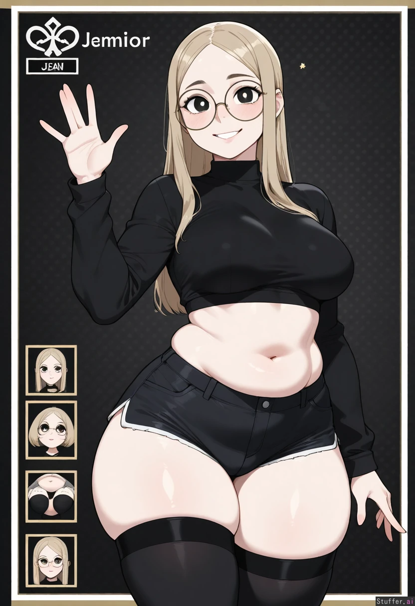 Solo, Krekkov (artist), KAMII MOMORU(artist), ((Flat colors)), perfect proportions, (straight hair hair, light brown hair, no bangs), dark eyes, cute face, large cute eyes, pale skin, cute pose, (((round glasses, (black cropped shirt), oversised cropped black shirt, long sleeves, black jean shorts, black thigh highs))), (manga style drawing, (monochrome)), character select screen, black background, thin gold frame, video game, cute pose, sexy pose, medium breasts, ((Skinny)), large muffin top (blushing, cute smile, wide eyes, stars in her eyes, waving, saying hi), fat, (thick thighs, fat thighs, bulging thighs, wide hips:1.2), (bigger breasts:1.1), (bigger belly:1.0), (big round belly, bloated)