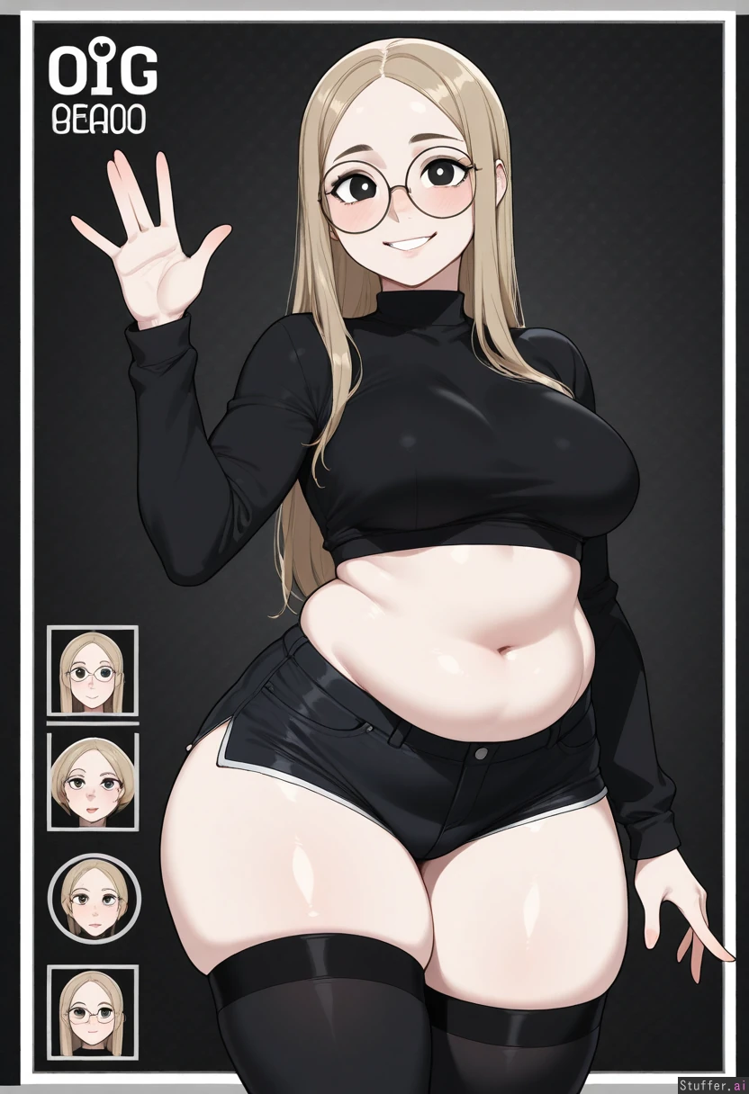 Solo, Krekkov (artist), KAMII MOMORU(artist), ((Flat colors)), perfect proportions, (straight hair hair, light brown hair, no bangs), dark eyes, cute face, large cute eyes, pale skin, cute pose, (((round glasses, (black cropped shirt), oversised cropped black shirt, long sleeves, black jean shorts, black thigh highs))), (manga style drawing, (monochrome)), character select screen, black background, thin gold frame, video game, cute pose, sexy pose, medium breasts, ((Skinny)), large muffin top (blushing, cute smile, wide eyes, stars in her eyes, waving, saying hi), fat, (thick thighs, fat thighs, bulging thighs, wide hips:1.2), (bigger breasts:1.1), (bigger belly:1.1), (big round belly, bloated)