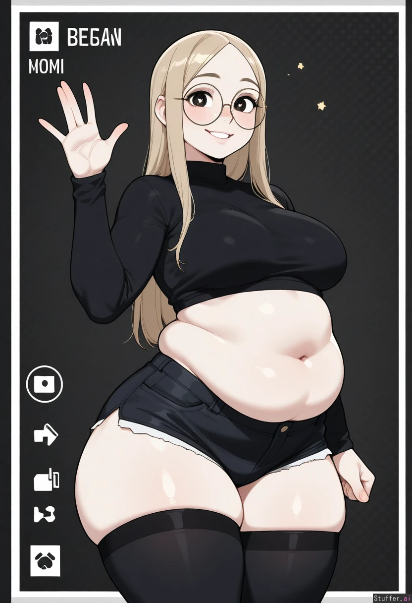 Solo, Krekkov (artist), KAMII MOMORU(artist), ((Flat colors)), perfect proportions, (straight hair hair, light brown hair, no bangs), dark eyes, cute face, large cute eyes, pale skin, cute pose, (((round glasses, (black cropped shirt), oversised cropped black shirt, long sleeves, black jean shorts, black thigh highs))), (manga style drawing, (monochrome)), character select screen, black background, thin gold frame, video game, cute pose, sexy pose, medium breasts, ((Skinny)), large muffin top (blushing, cute smile, wide eyes, stars in her eyes, waving, saying hi), fat, (thick thighs, fat thighs, bulging thighs, wide hips:1.2), (bigger breasts:1.1), (bigger belly:1.3), (big round belly, bloated)
