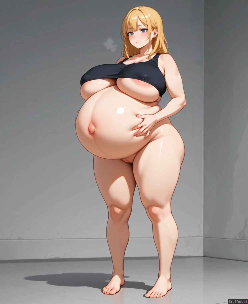 adult, female, standing, fully nude, sexy pussy potbelly, hands_on_belly, underboob Massive belly Hyper pregnant:1.0 Super tight clothes Perfect face Sexy feet Huge boobs