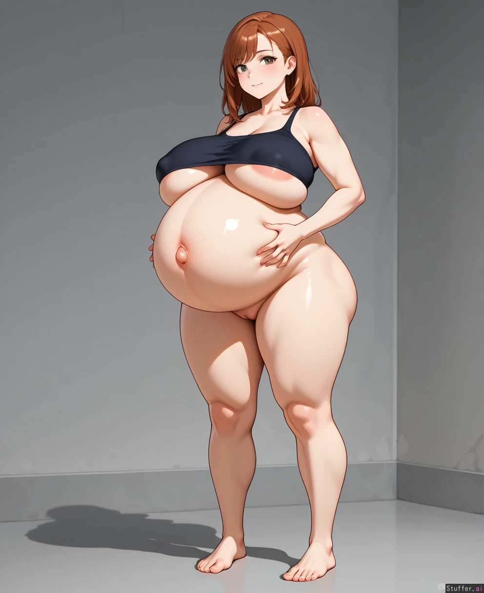 adult, female, standing, fully nude, sexy pussy potbelly, hands_on_belly, underboob Massive belly Hyper pregnant:1.2 Super tight clothes Perfect face Sexy feet Huge boobs