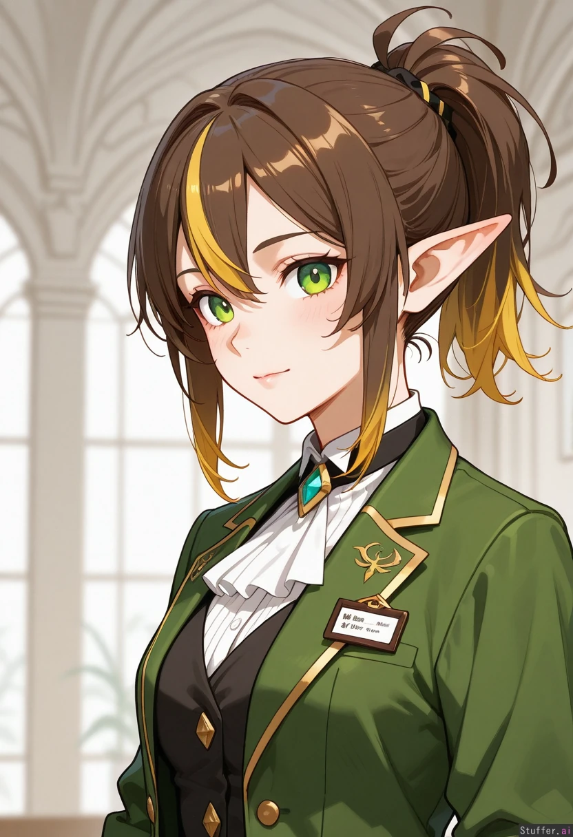 (Solo), Highres, Ponytail, brown hair, blonde tips, two-tone hair, guild receptionist, elf ears, green eyes, green crop jacket