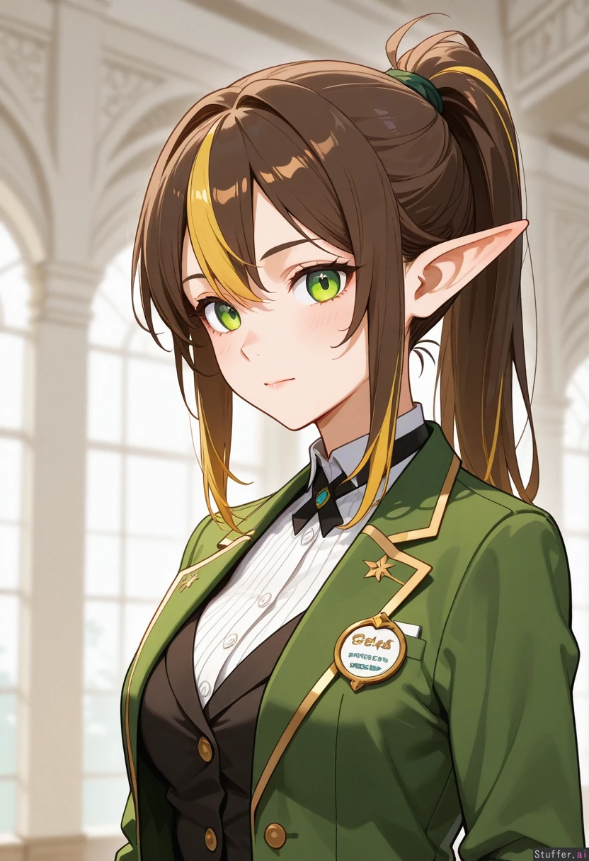 (Solo), Highres, long Ponytail, brown hair, blonde tips, two-tone hair, guild receptionist, elf ears, green eyes, green crop jacket