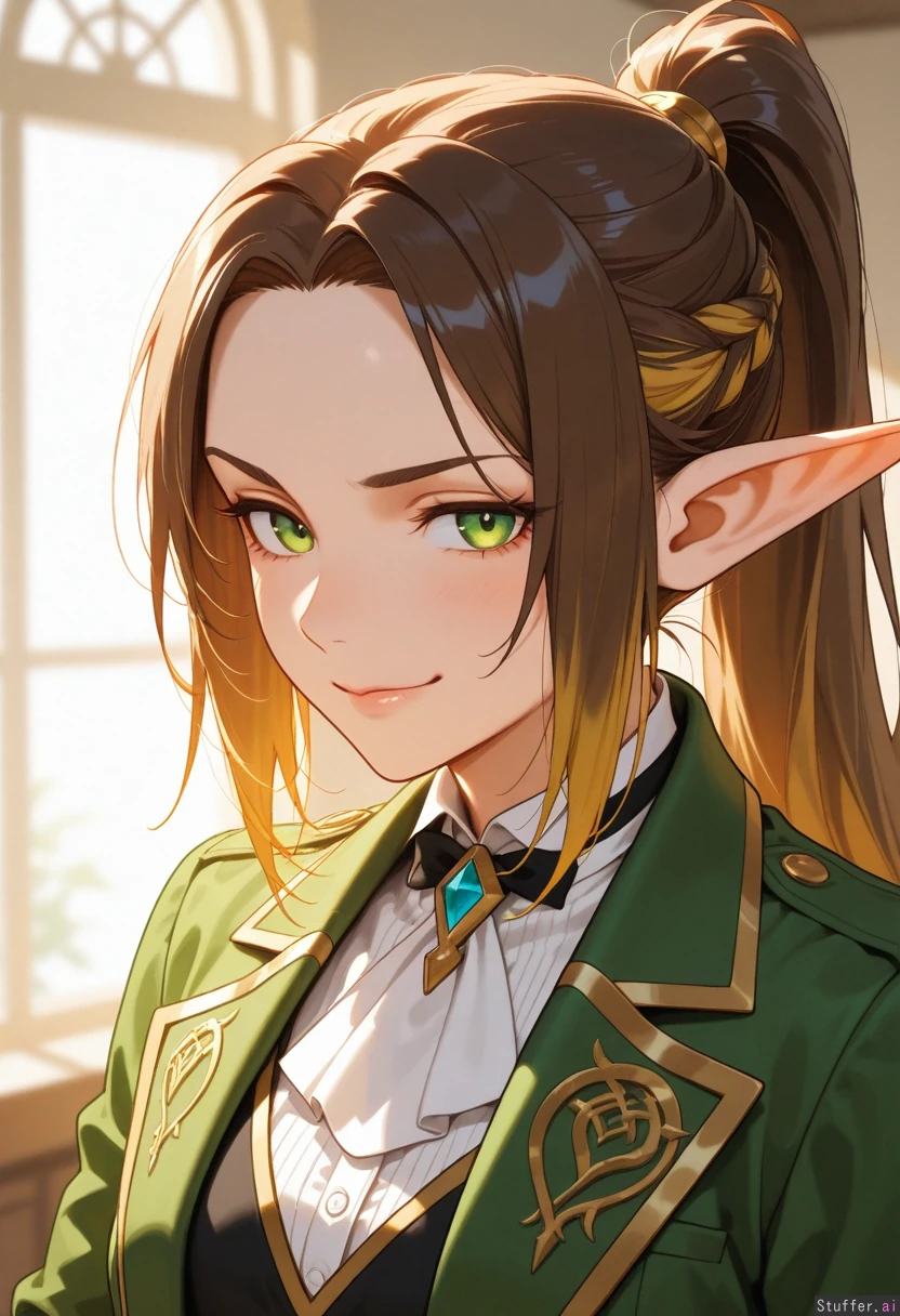 (Solo), Highres, long Ponytail, brown hair, blonde tips, two-tone hair, guild receptionist, elf ears, green eyes, green crop jacket, smirk,