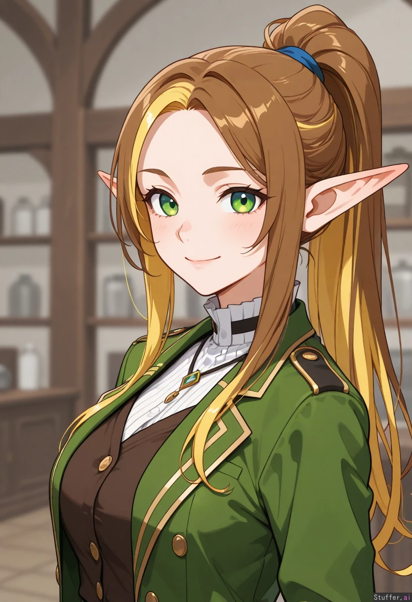 (Solo), Highres, long Ponytail, brown hair, blonde tips, two-tone hair, guild receptionist, elf ears, green eyes, green crop jacket, smile,