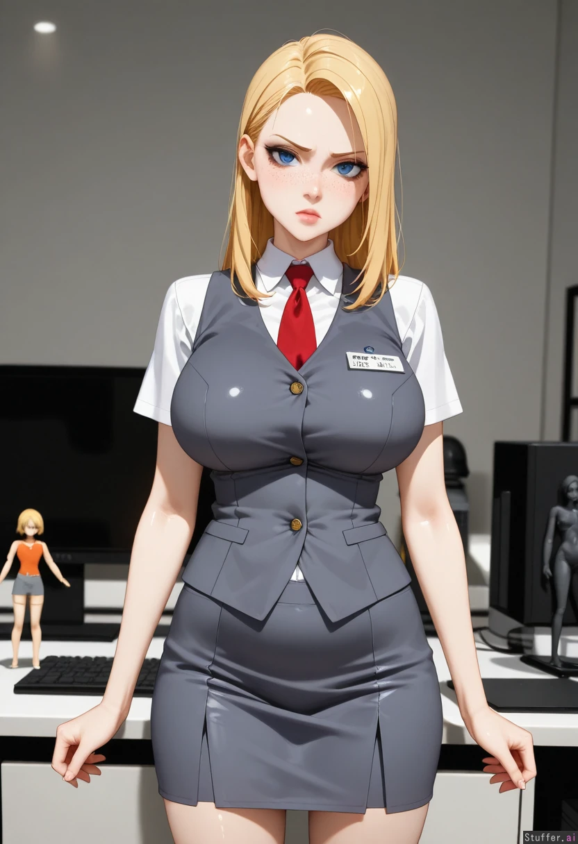 High quality, high res, 8k, best quality (Masterpiece), 1girl, (adult female), (highly detailed face), detailed eyes, (solo), mature, (20ya woman), (thick black outlines), (animation), (soft lighting), (stylized western animation) looking at viewer, (pouting), (proud) standing blue eyes, (long straight blonde hair), (thick lips), (makeup), (dark eyeshadow), (pale skin), (freckles), (blush:.7), (shiny skin) (Tight grey vest), (shortsleeve white shirt), (red tie), (short grey skirt), (strained buttons) (slim figure:1.8), (enormous breasts:0.89), (extremely overweight:1.0), (massive weight gain:1.0), (chubby belly:1.0) (Posing in office space), (slight side view)