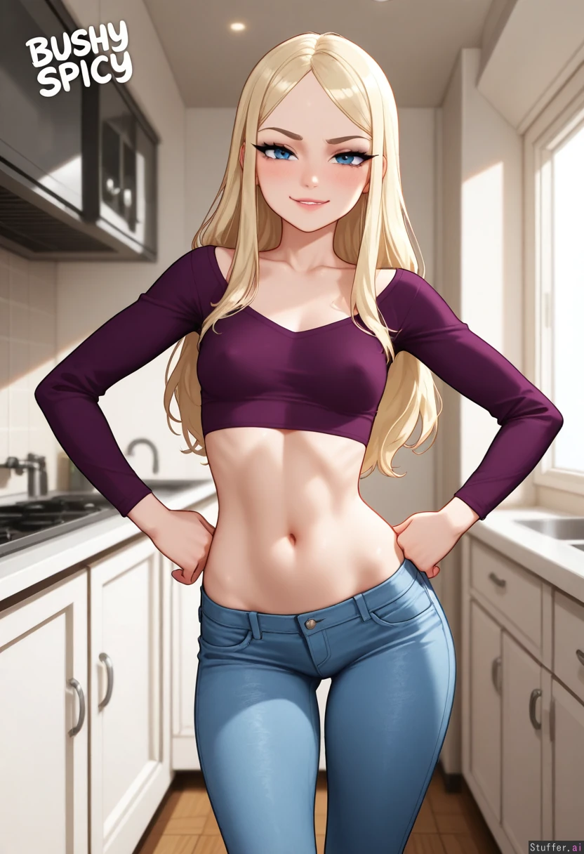 (c.cu), blushyspicy, KAMII MOMORU (artist), betterwithsalt, best quality, (anime), beautiful, intricate details, hdr 1woman, gorgeous, beautiful, ((mature, milf)), (looking at viewer), blonde hair, light-blue eyes, (hair bangs), long hair, looking at viewer, sexy pose, wide hips, erect nipples, smirk, slight side view Crop top, skinny jeans, arms on hips Posing in kitchen, warm lighting, (Slim figure:1.9), (small breasts), (morbidly obese ssbbw:1.00), (large overfed hanging belly:1.0), (chubby face:1.0), (fatter features:1.0)