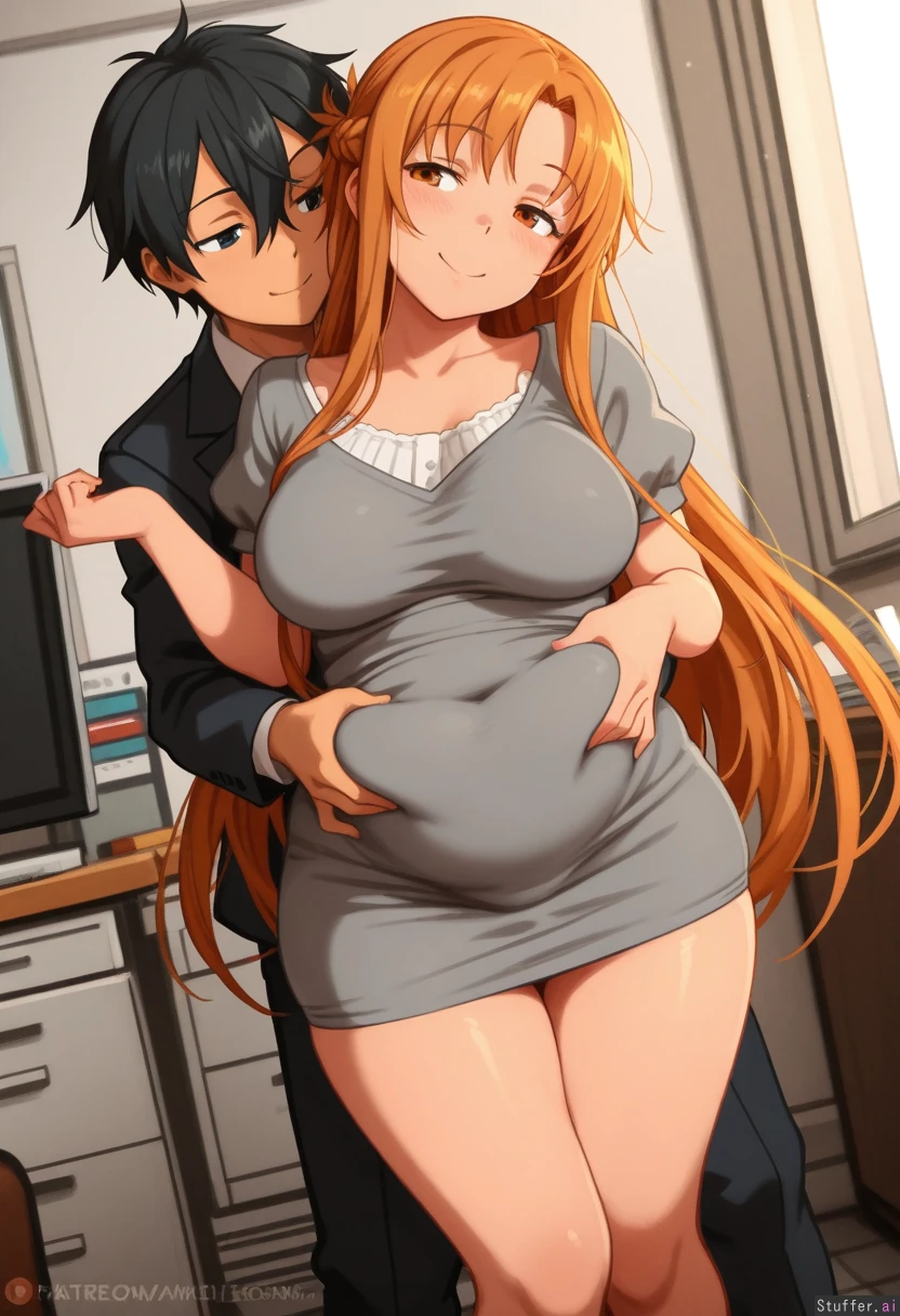 khyle.(artist) romantic_couple, asuna_(sao-alo), kirito, flirting, tight clothes, office clothes, gray dress, belly, legs,curvy, potbelly, stuffed_belly, plump, bloated, grabbing_from_behind, belly_grab