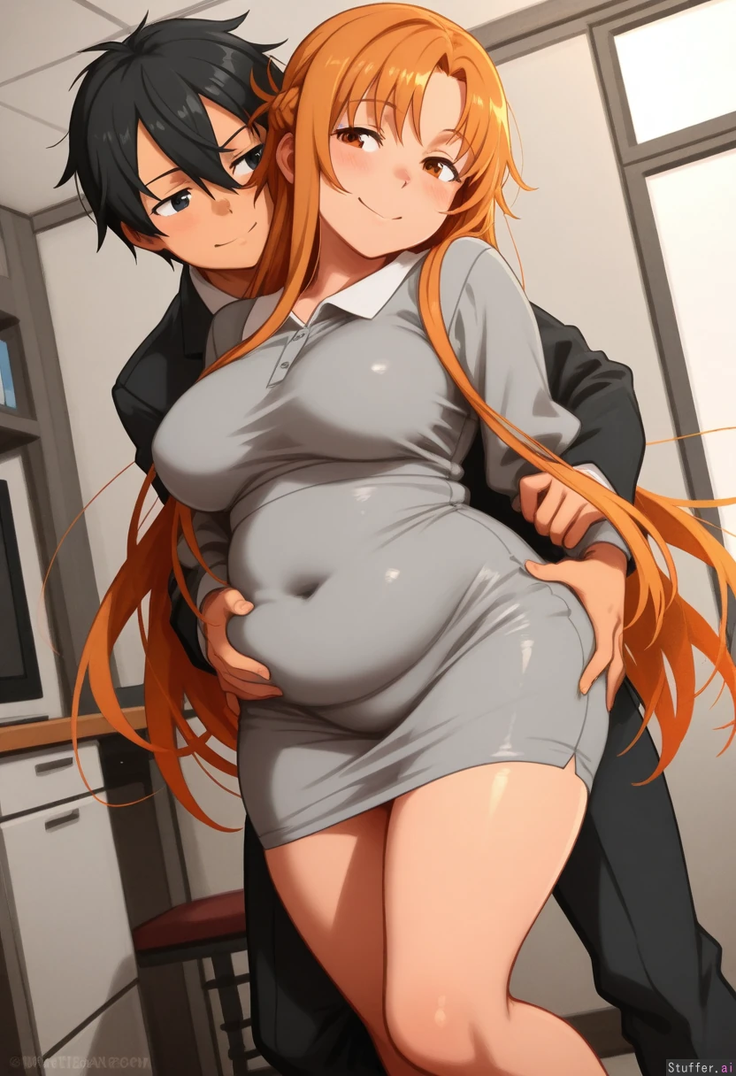 khyle.(artist) romantic_couple, asuna_(sao-alo), kirito, flirting, tight clothes, office clothes, gray dress, belly, legs,curvy, potbelly, stuffed_belly, plump, bloated, fat belly, grabbing_from_behind, grabbing_ass