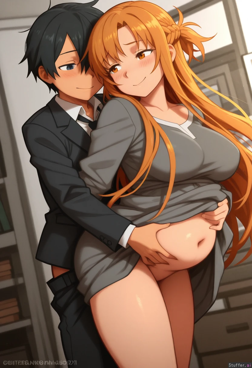 khyle.(artist) romantic_couple, asuna_(sao-alo), kirito, flirting, tight clothes, office clothes, gray dress, belly, legs,curvy, potbelly, stuffed_belly, plump, bloated, fat belly, grabbing_from_behind, belly_grab, dress_lift, sex_from_behind