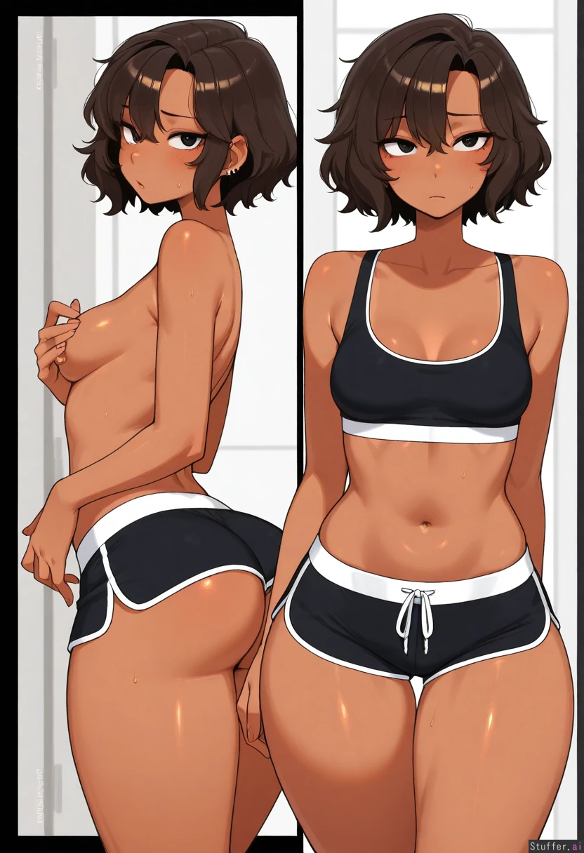 absurdres, 8k, perfect anatomy, masterpiece, beautiful face, beautiful eyes, RockSolidArt. /(artist/), RockSolidArt(artist/) ,8), cute, 1girl, (tall female:1.3), latina, brown skin, tanned, dark brown hair, wavy hair, hazel eyes, (short hair), (thick fluffy hair), bangs, dolphin shorts, reserved,), shy, big ass stretched_clothing, sweating, (merunyaa, (usa37107692:1.2), (ohasi_art), betterwithsalt), petite, slender, (((thick thighs)), (wide hips), breast_size_tiny ((covering her breasts)), standing, nipple_piercings, perky_breasts, small breasts adult