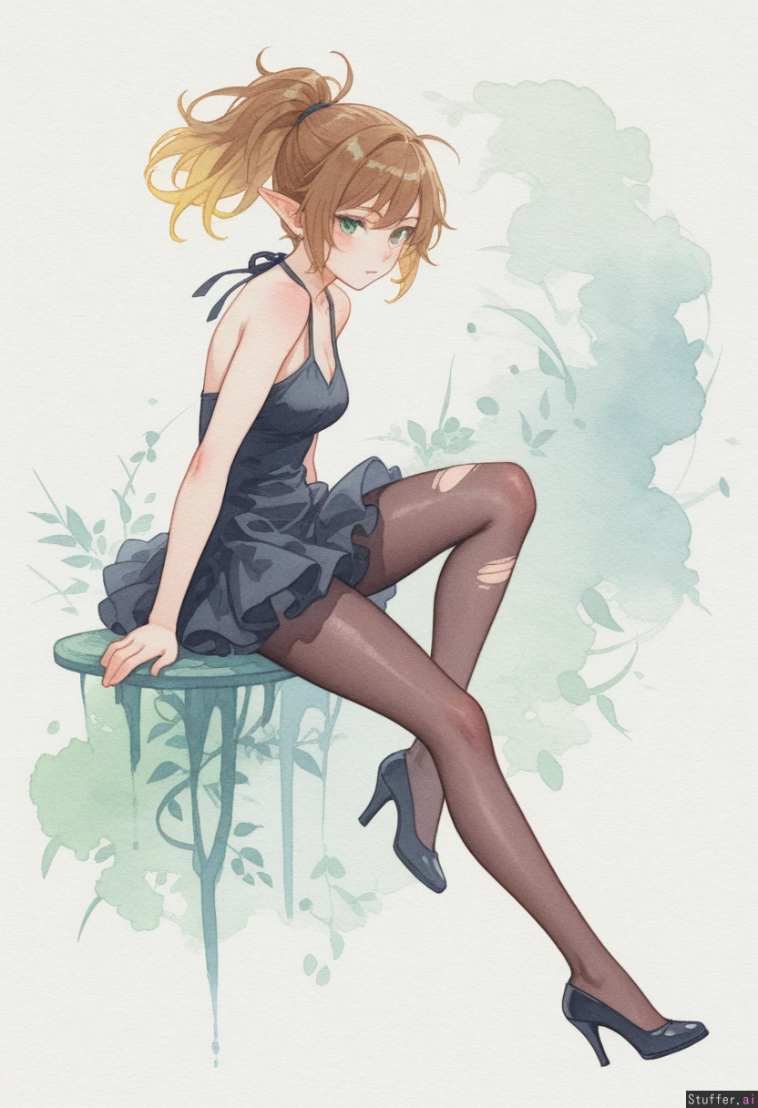 Solo, ((two tone hair)), ((brown_hair)), blonde tips, long ponytail, side part, competitive, green eyes, full body, cocktail dress, black dress, lbd, minidress, fantasy, detailed_face, (watercolor_(medium): 1.5), watercolor_pencil_(medium), looking_at_viewer, two_tone_hair, elf_ears, (detailed_eyes), tomboy, seductive, tights, high heels, torn_clothes