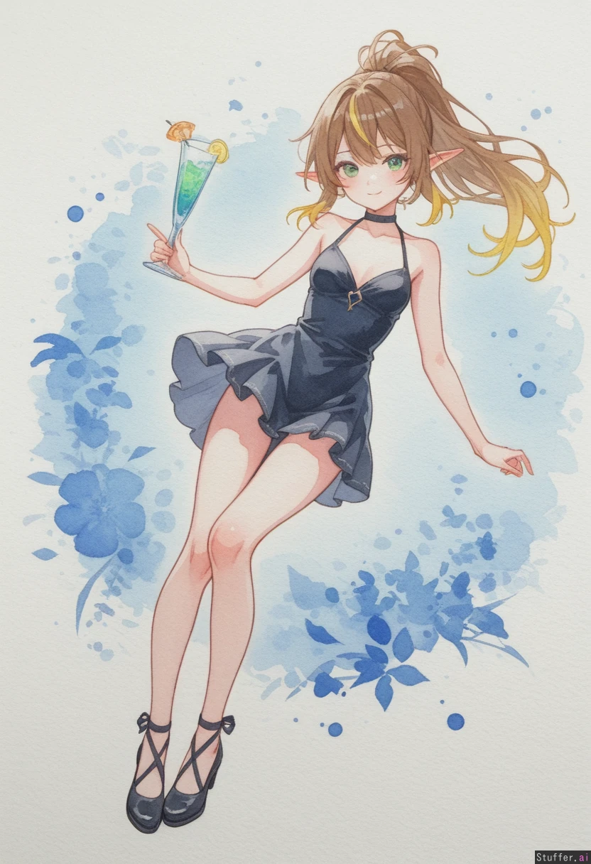 Solo, ((two tone hair)), ((brown_hair)), blonde tips, long ponytail, side part, competitive, green eyes, full body, cocktail dress, black dress, lbd, minidress, fantasy, detailed_face, (watercolor_(medium): 1.5), watercolor_pencil_(medium), looking_at_viewer, two_tone_hair, elf_ears, (detailed_eyes), tomboy, seductive,