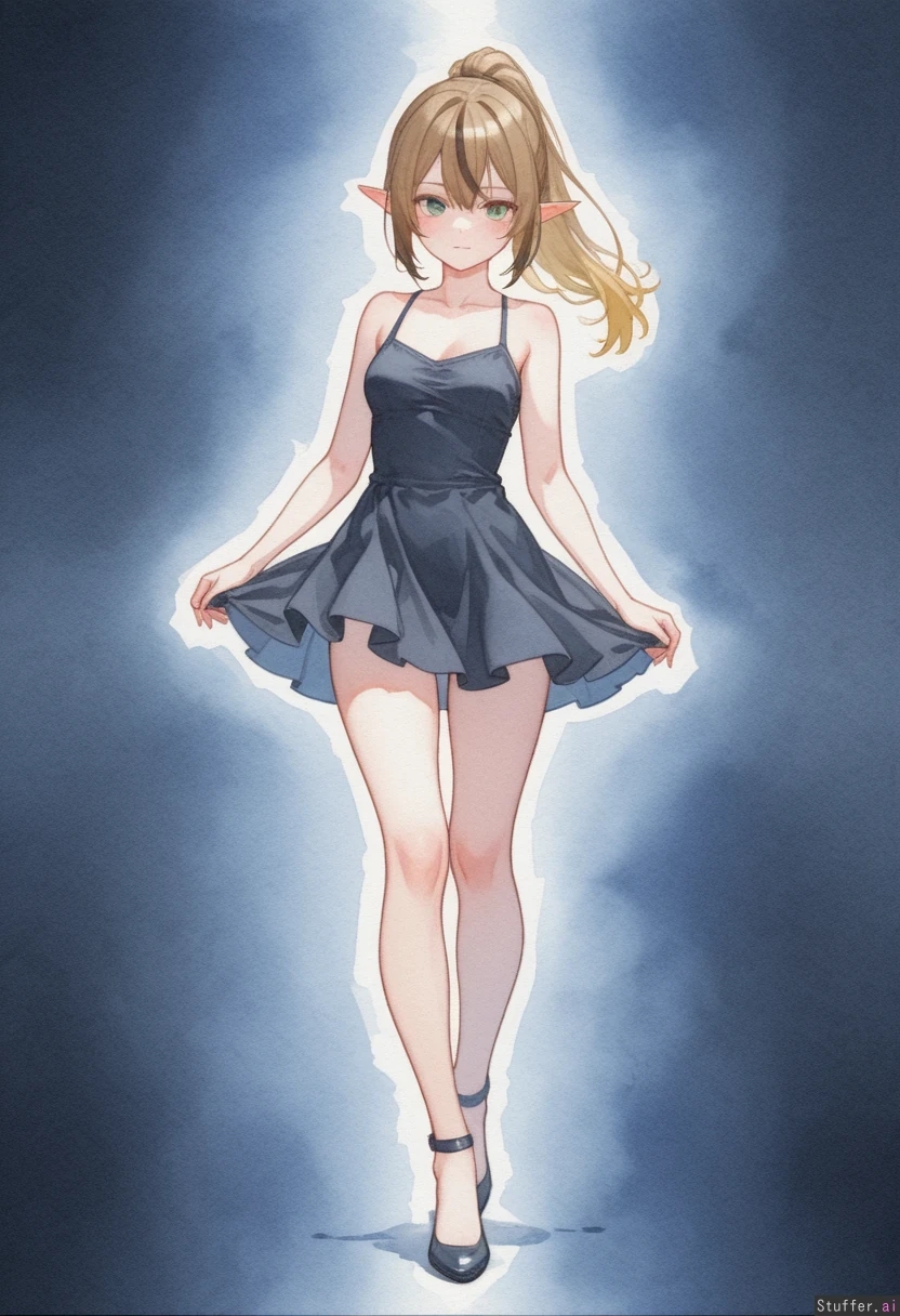 Solo, ((two tone hair)), ((brown_hair)), blonde tips, long ponytail, side part, competitive, green eyes, full body, cocktail dress, black dress, lbd, minidress, fantasy, detailed_face, (watercolor_(medium): 1.5), watercolor_pencil_(medium), looking_at_viewer, two_tone_hair, elf_ears, (detailed_eyes), tomboy, seductive,