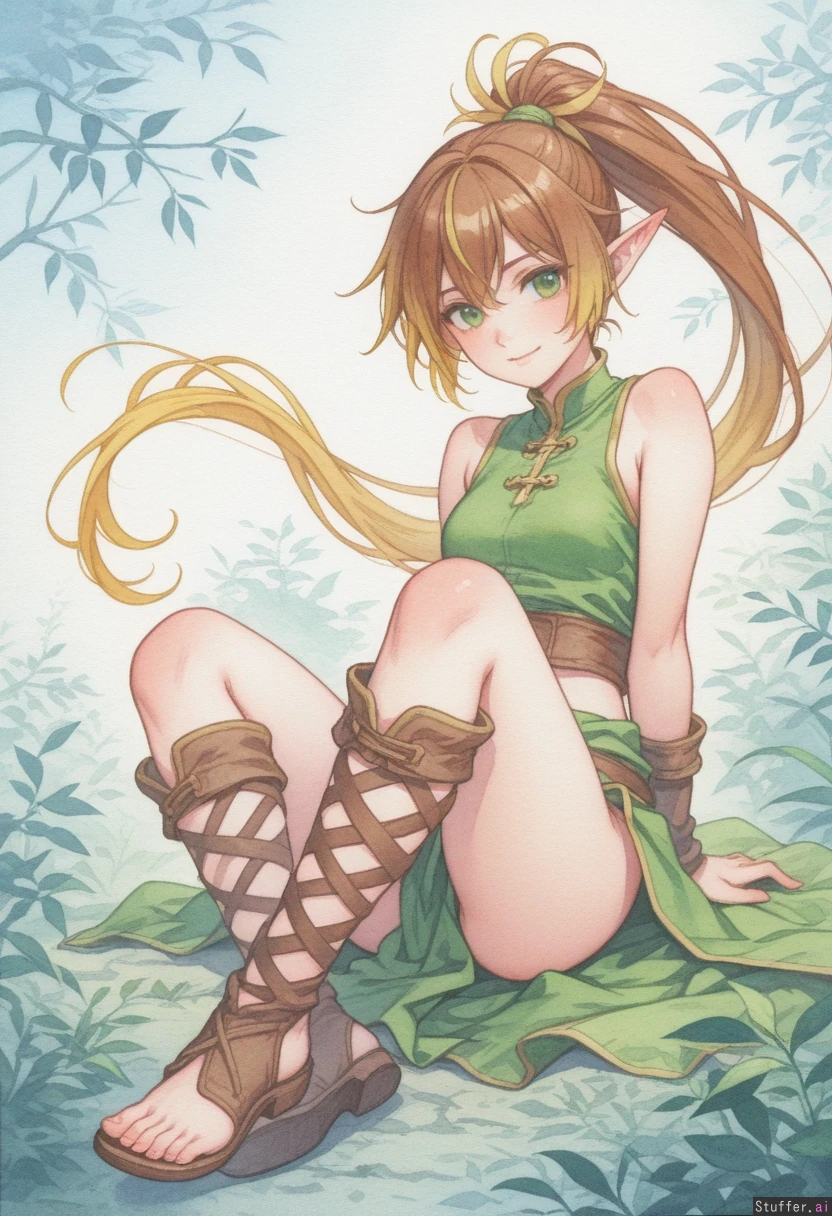 Solo, ((two tone hair)), ((brown_hair)), blonde tips, long ponytail, side part, competitive, green eyes, full body, fantasy, detailed_face, (watercolor_(medium): 1.5), watercolor_pencil_(medium), looking_at_viewer, two_tone_hair, elf_ears, (detailed_eyes), tomboy, seductive,