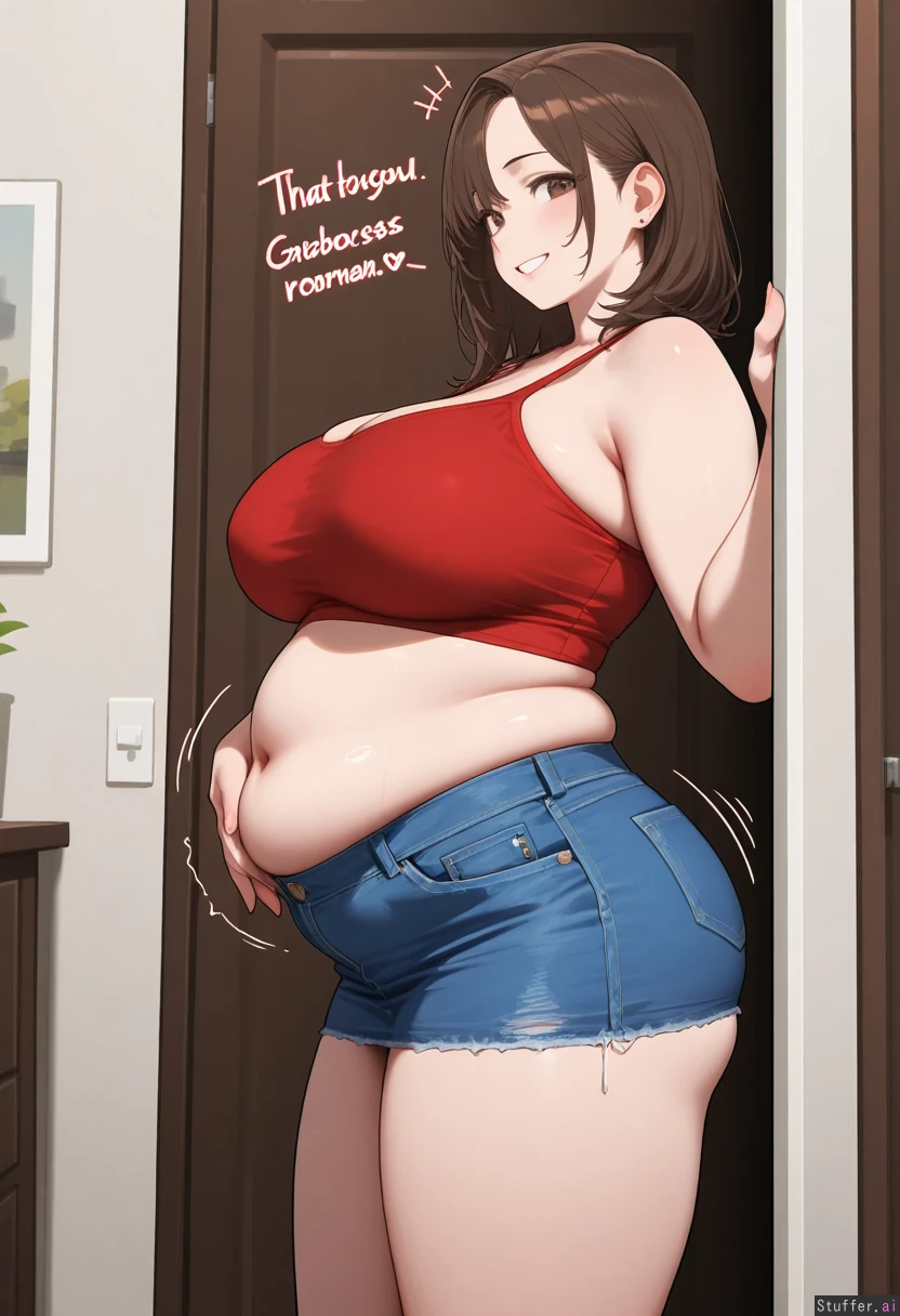 Gorgeous girl. Pretty, detailed face. 8k detail. Brown eyes. Short, messy, brown hair. Big smile. Wearing red crop top. Wearing blue denim mini skirt. Standing in room. slightly_chubby. Side view. Soft, bloated belly. jiggling belly.