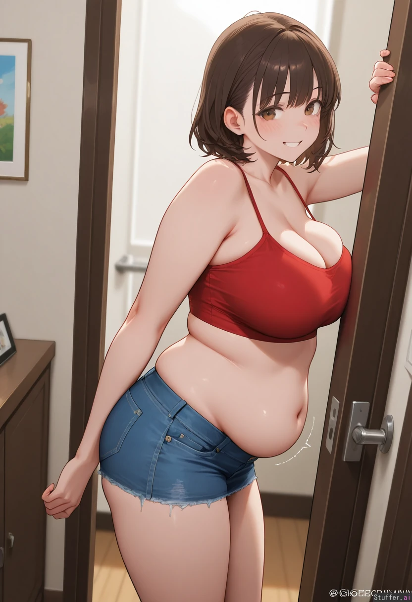 Gorgeous girl. Pretty, detailed face. 8k detail. Brown eyes. Short, messy, brown hair. Big smile. Wearing red crop top. Wearing blue denim mini skirt. Standing in room. slightly_chubby. Side view. Soft, bloated belly. jiggling belly.
