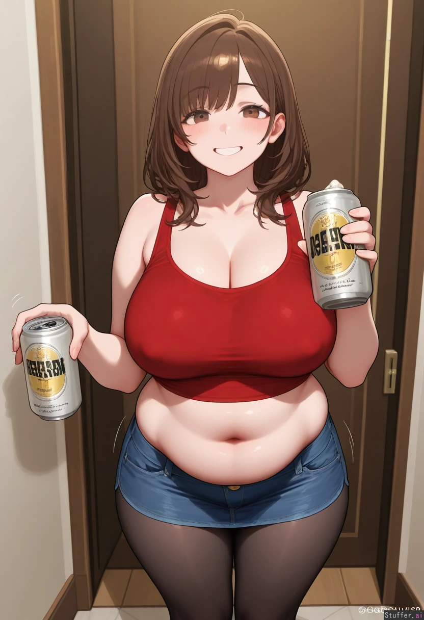 Gorgeous girl. Pretty, detailed face. 8k detail. Brown eyes. Short, messy, brown hair. Big smile. Blushing. Wearing red crop top. Wearing blue denim mini skirt. Wearing black tights. Standing in room. slightly_chubby belly. Soft, bloated belly. jiggling belly. hanging_belly. Holding can of beer.