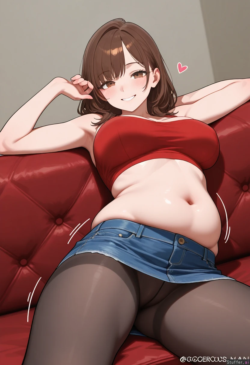 Gorgeous girl. Pretty, detailed face. 8k detail. Brown eyes. Short, messy, brown hair. Big smile. Blushing. Wearing red crop top. Wearing blue denim mini skirt. Wearing black tights. Laying on couch. Soft, bloated belly. jiggling belly. hanging_belly.