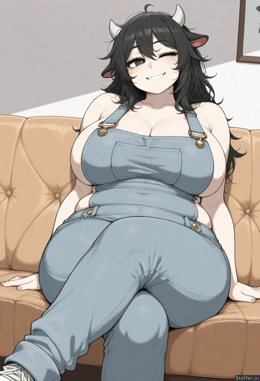 (masterpiece:1.9), 4k, anime_coloring, 1girl, solo, krekkov_(artist), pale_skin, overalls, cow_ears, large_breasts, (chubby:1.5), black_hair, long_hair, messy_hair, couch, sitting, crossed_legs, wink