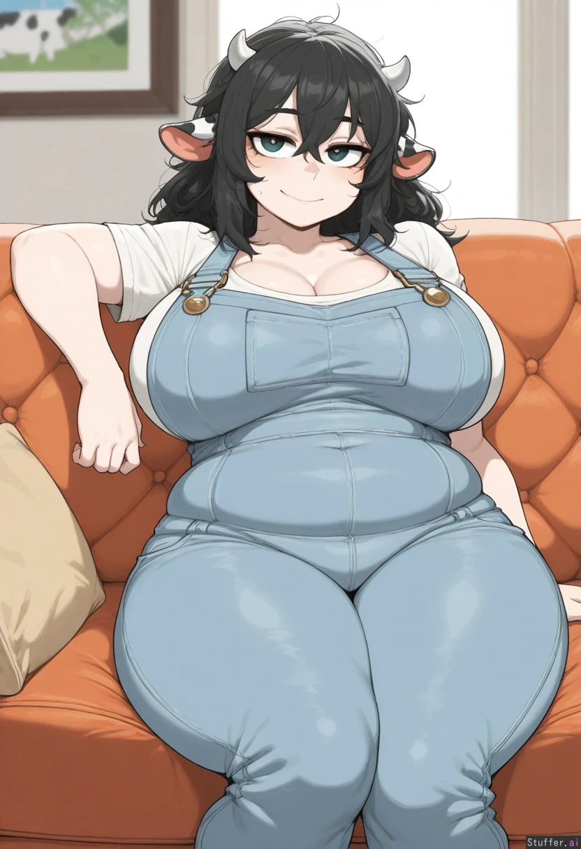 (masterpiece:1.9), 4k, anime_coloring, 1girl, solo, krekkov_(artist), pale_skin, overalls, cow_ears, large_breasts, (chubby:1.5), black_hair, long_hair, messy_hair, couch, soft_smile