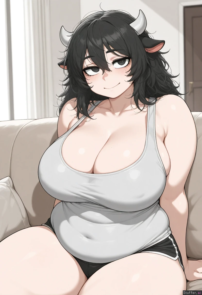 (masterpiece:1.9), 4k, anime_coloring, 1girl, solo, krekkov_(artist), pale_skin, tank_top, cow_ears, large_breasts, (chubby:1.5), black_hair, long_hair, messy_hair, couch, soft_smile