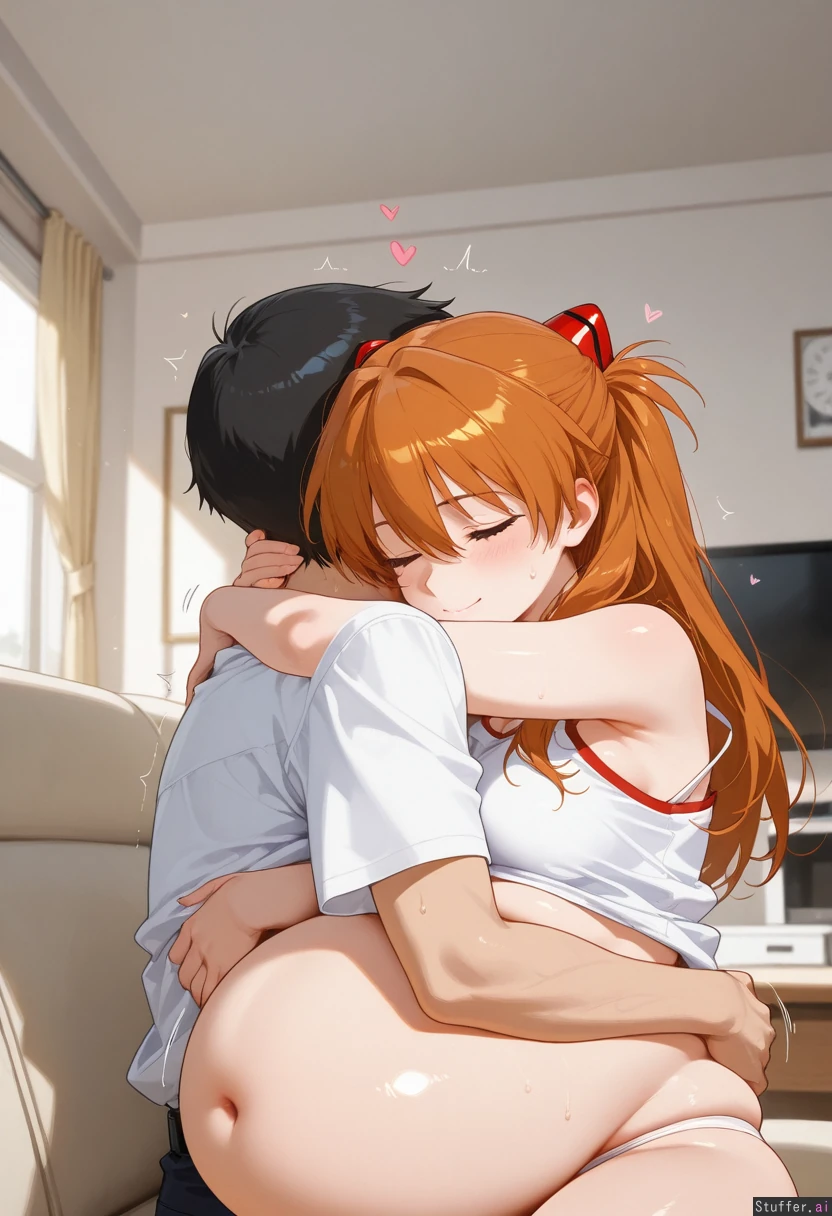 Detailed Background, (Masterpiece), Best_quality, intricate_detail, perfect image, (heart), effect, motion lines, one on one, pure, couple, (at home), (1girl, ((((Asuka langley, chubby, massive flattering belly, huge spherical fat belly, potbelly, , hug,)) (1boy, ((((Ikari Shinji), slim, look at her belly,))))) happy, love each other,
