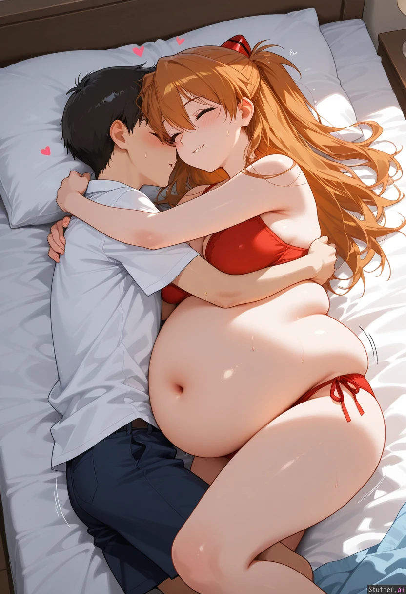 Detailed Background, (Masterpiece), Best_quality, intricate_detail, perfect image, (heart), effect, motion lines, one on one, pure, couple, (at home), (1girl, ((((Asuka langley, chubby, massive flattering belly, huge spherical fat belly, potbelly,)) (1boy, ((((Ikari Shinji), slim, ))))) happy, love each other,lying on bed,hugging