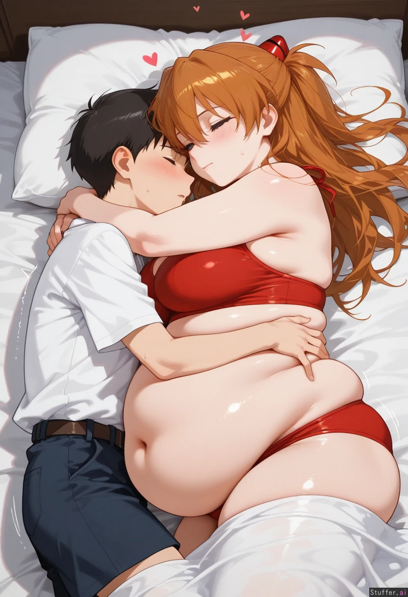 Detailed Background, (Masterpiece), Best_quality, intricate_detail, perfect image, (heart), effect, motion lines, one on one, pure, couple, (at home), (1girl, ((((Asuka langley, chubby, massive flattering belly, huge spherical fat belly, potbelly,)) (1boy, ((((Ikari Shinji), slim, ))))) love each other,lying on bed,hugging