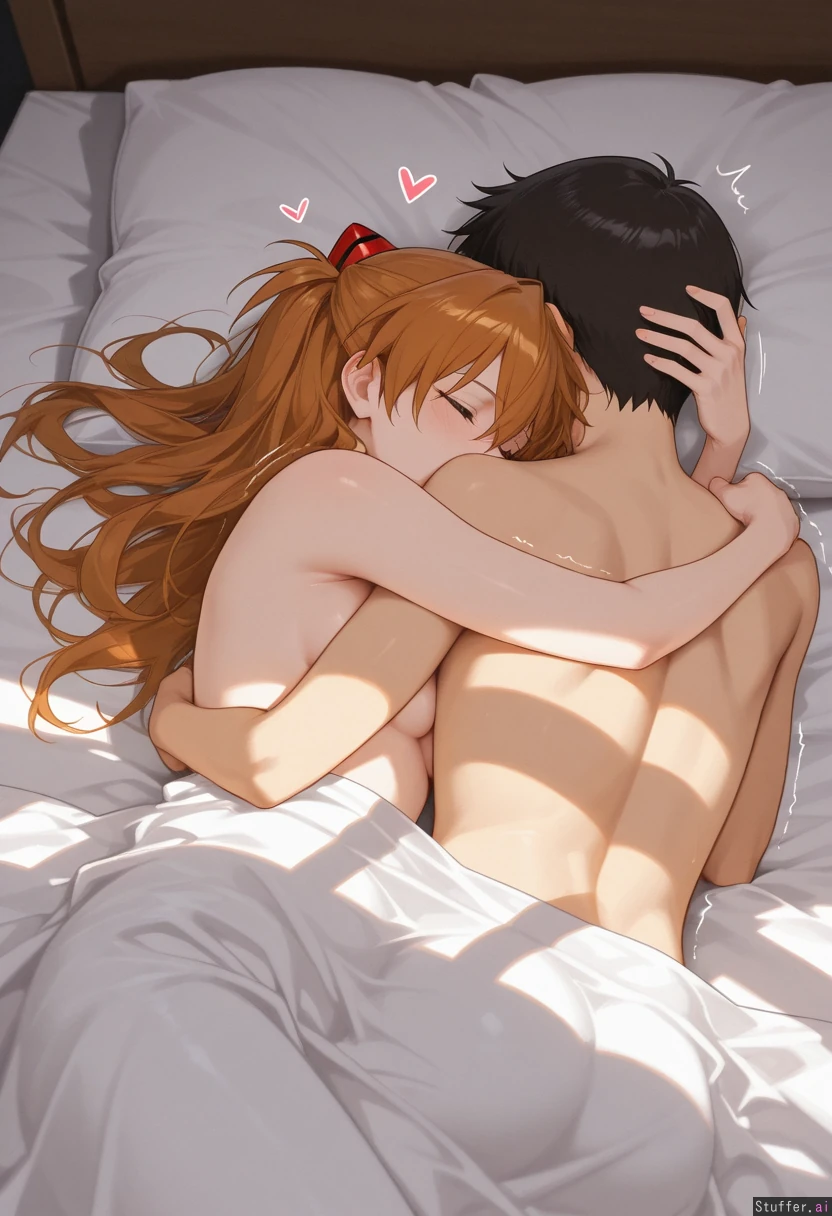 Detailed Background, (Masterpiece), Best_quality, intricate_detail, perfect image, (heart), effect, motion lines, one on one, pure, couple, (at home), (1girl, ((((Asuka langley, chubby, )) (1boy, ((((Ikari Shinji), slim, ))))) naked,love each other,lying on bed,hugging