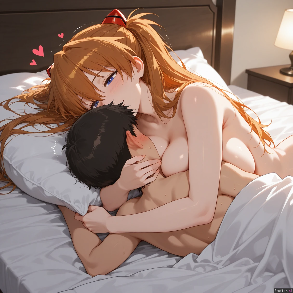 Detailed Background, (Masterpiece), Best_quality, intricate_detail, perfect image, (heart), effect, motion lines, one on one, pure, couple, (at home), (1girl, ((((Asuka langley, chubby, huge breasts,)) (1boy, ((((Ikari Shinji), slim, ))))) naked,love each other,lying on bed,hugging