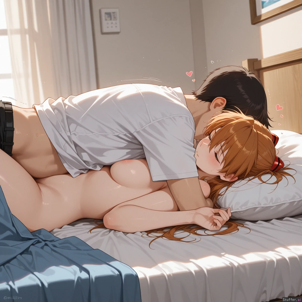 Detailed Background, (Masterpiece), Best_quality, intricate_detail, perfect image, (heart), effect, motion lines, one on one, pure, couple, (at home), (1girl, ((((Asuka langley, chubby, plump,fat)) (1boy, ((((Ikari Shinji), slim,strong ))))) naked,love each other,lying on bed,hugging