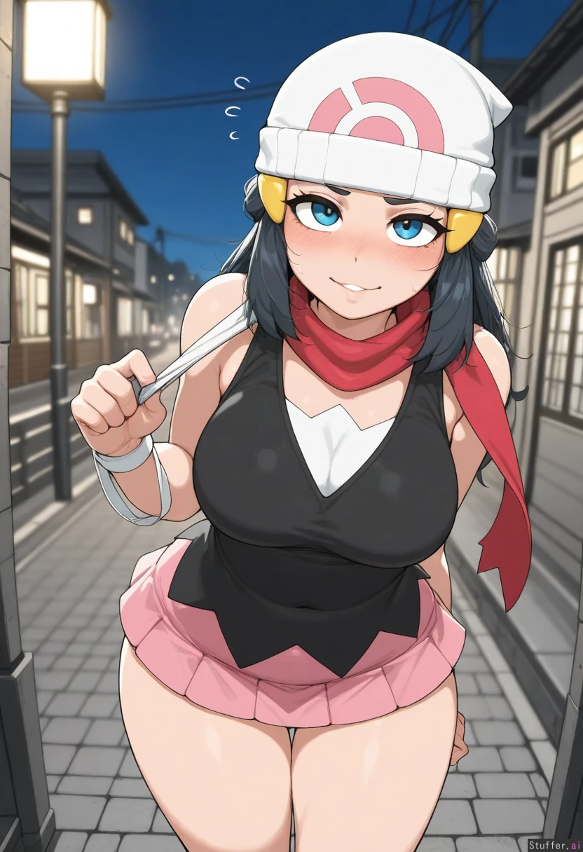 (masterpiece:1.9), anime_coloring, 4k, krekkov_(artist), 1girl, solo, dawn_(pokemon), street, night, plump_lips, pink_lips, blush_lines, soft_smile,
