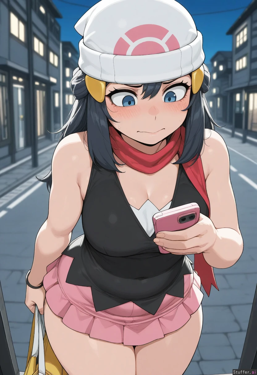 (masterpiece:1.9), anime_coloring, 4k, krekkov_(artist), 1girl, solo, dawn_(pokemon), street, night, plump_lips, pink_lips, smartphone, wavy_mouth, looking_down