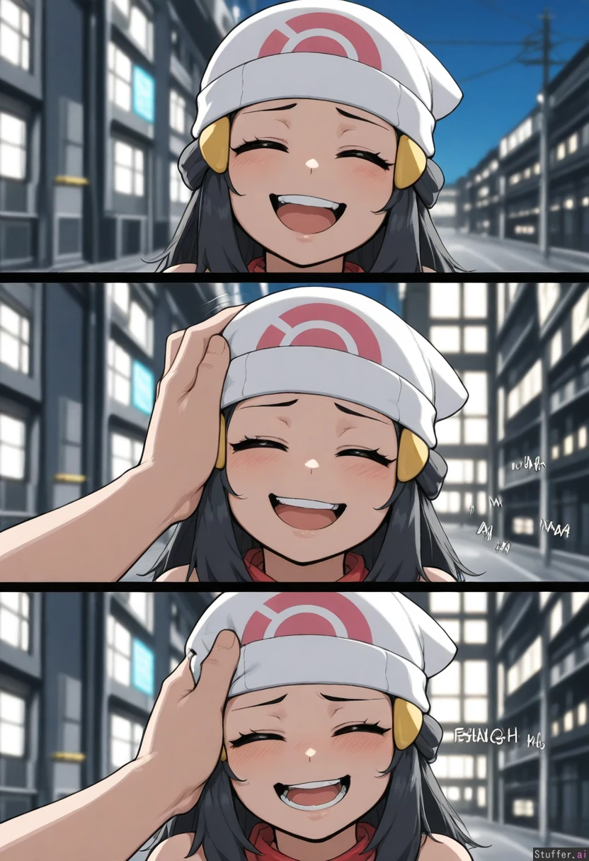 (masterpiece:1.9), anime_coloring, 4k, krekkov_(artist), 1girl, solo, dawn_(pokemon), street, night, plump_lips, pink_lips, closed_eyes, laughing, head_scratching, flustred