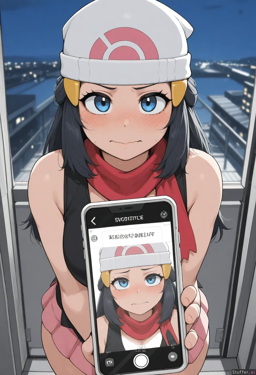(masterpiece:1.9), anime_coloring, 4k, krekkov_(artist), 1girl, solo, dawn_(pokemon), night, plump_lips, pink_lips, commute, wavy_mouth, smartphone, blush_lines