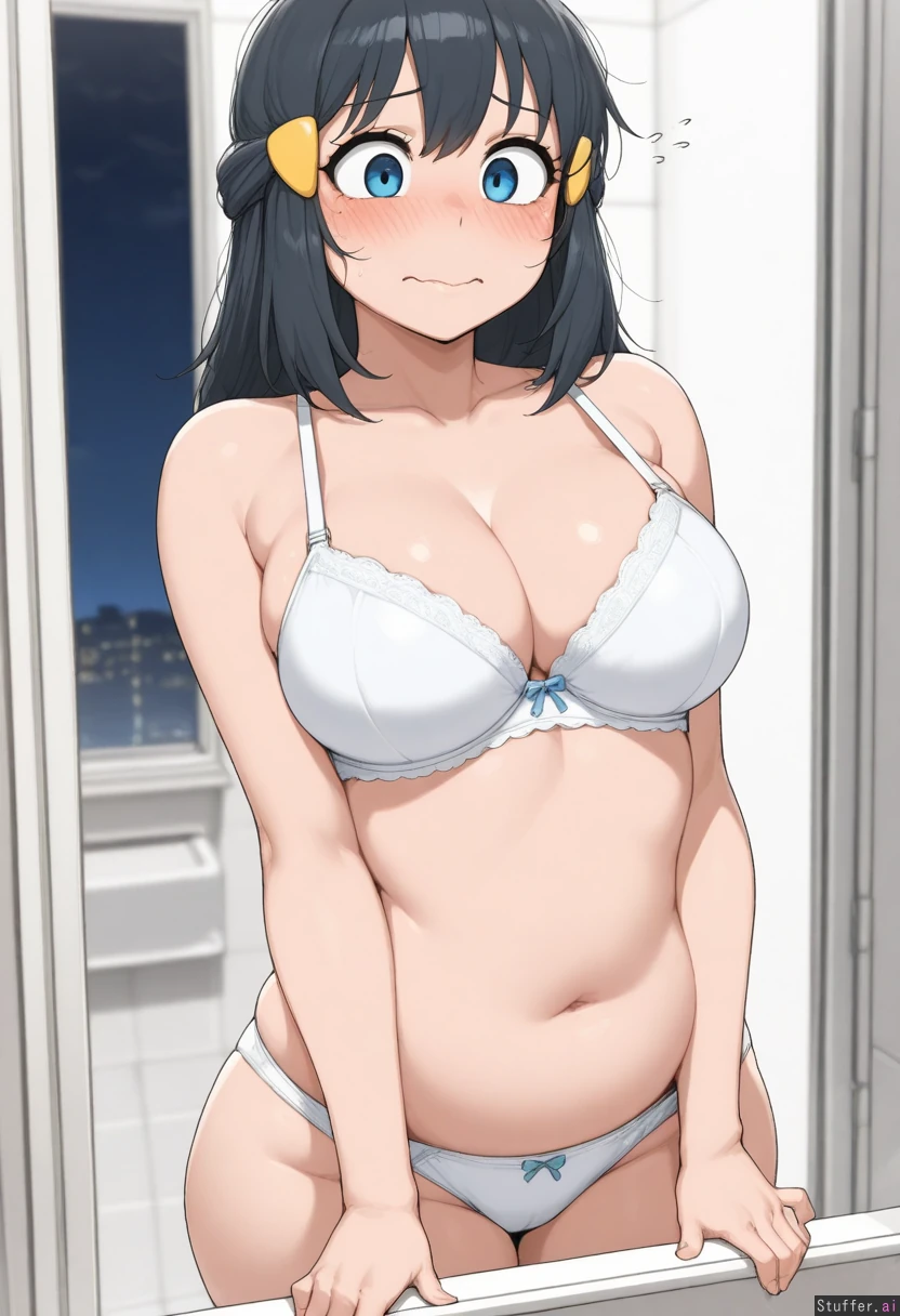 (masterpiece:1.9), anime_coloring, 4k, krekkov_(artist), 1girl, solo, dawn_(pokemon), night, plump_lips, pink_lips, bathroom, bra, white_panties, hands_on_belly, navel, blush, wavy_mouth