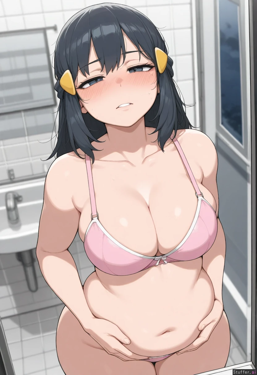 (masterpiece:1.9), anime_coloring, 4k, krekkov_(artist), 1girl, solo, dawn_(pokemon), night, plump_lips, pink_lips, bra, bathroom, (hands_on_belly:1.2), tired, blushing,