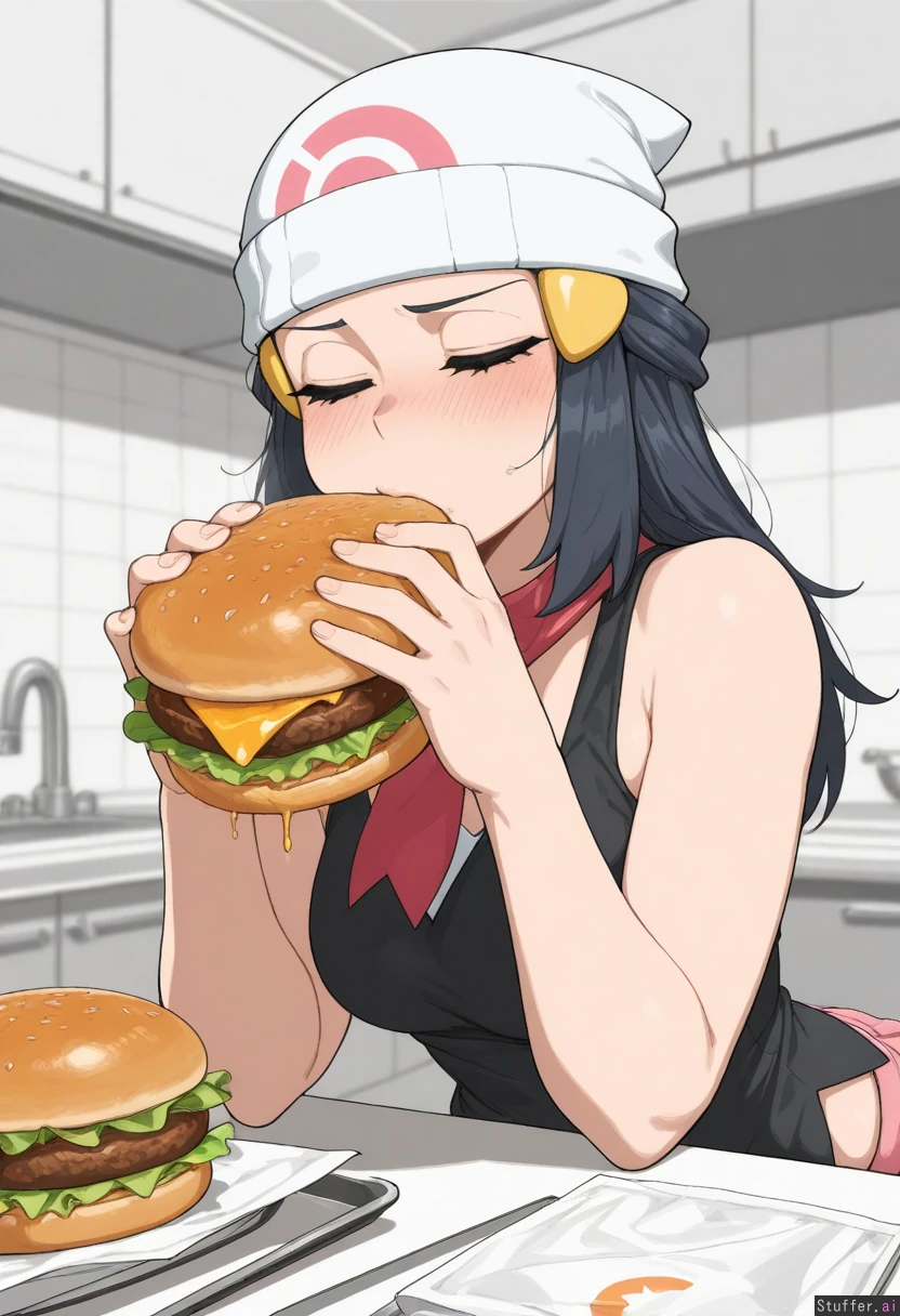 (masterpiece:1.9), anime_coloring, 4k, krekkov_(artist), 1girl, solo, dawn_(pokemon), plump_lips, pink_lips, kitchen, blushing, tank_top, closed_eyes, burger, eating