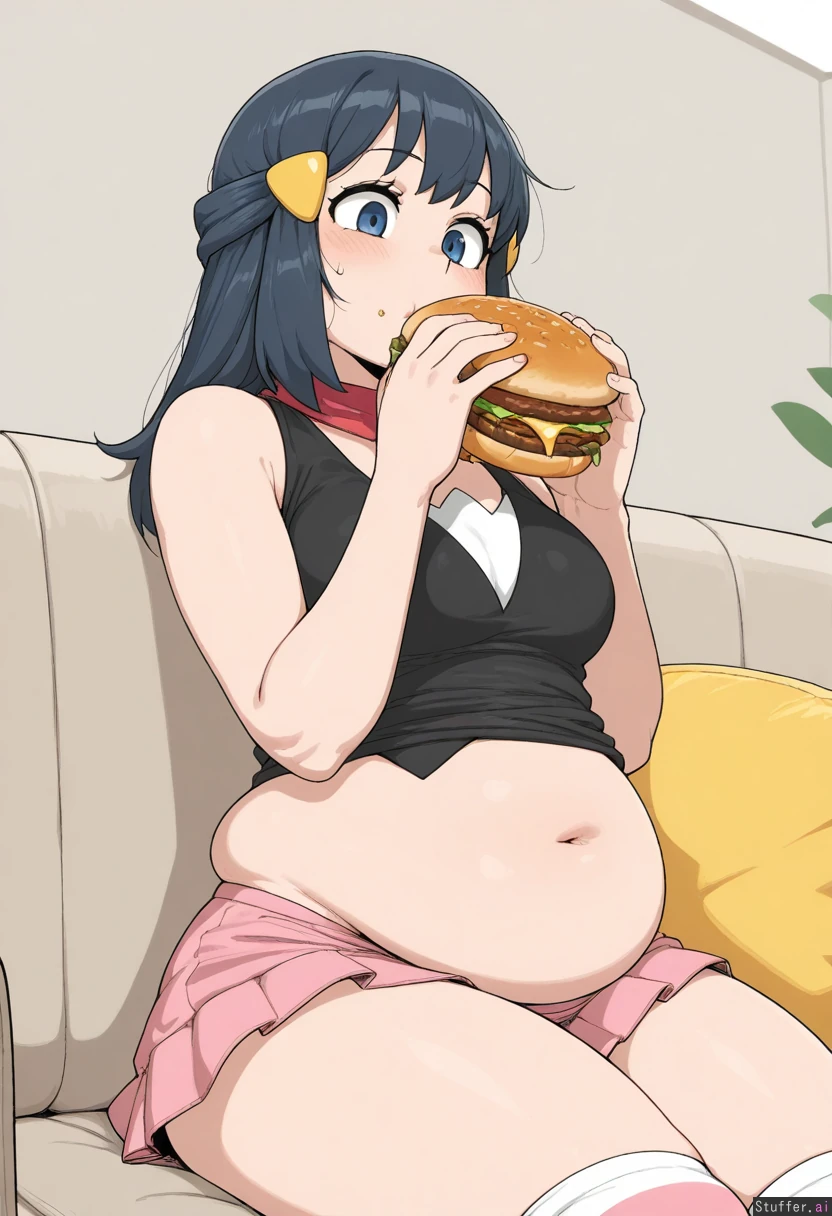(masterpiece:1.9), anime_coloring, 4k, krekkov_(artist), 1girl, solo, dawn_(pokemon), plump_lips, pink_lips, couch, (chubby:1.2), eating, burger, bloated_belly