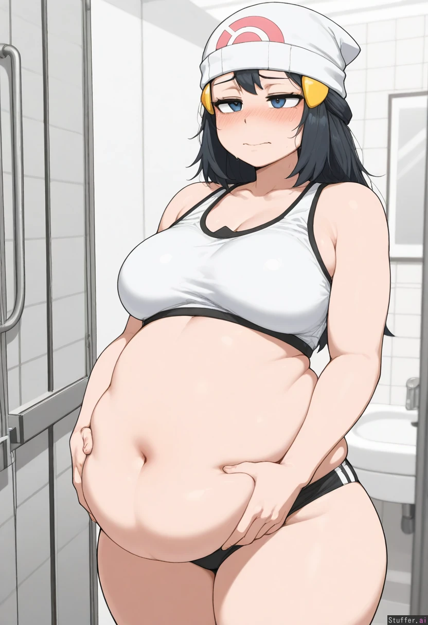 (masterpiece:1.9), anime_coloring, 4k, krekkov_(artist), 1girl, solo, dawn_(pokemon), plump_lips, pink_lips, bathroom, (chubby:1.5) bloated_belly, half-closed_eyes, blush_lines, sports_bra, large_belly, (hands_on_belly:1.3), wavy_mouth