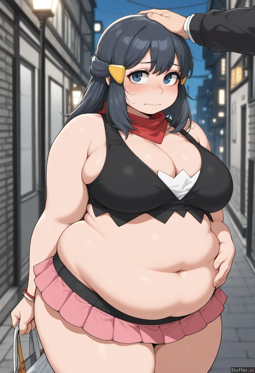 (masterpiece:1.9), anime_coloring, 4k, krekkov_(artist), 1girl, solo, dawn_(pokemon), plump_lips, pink_lips, street, night, (chubby:1.7) blush_lines, large_belly, wavy_mouth, headpat, skirt