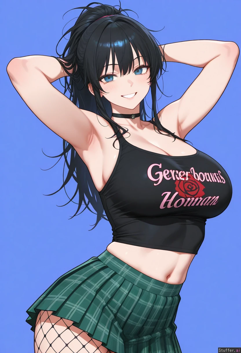 Gorgeous girl. Sexy, detailed face. Blue, gorgeous eyes. Long Messy black hair in a messy ponytail. Big, sexy smile. Wearing white, cropped tank top with rose design on front. Wearing green pleated, plaid_skirt. Wearing pink fishnet_pantyhose.