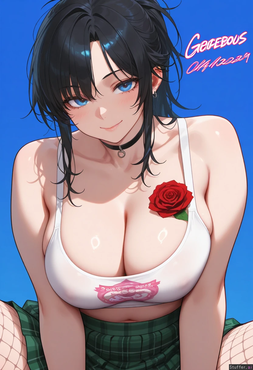 Gorgeous girl. Sexy, detailed face. Blue, gorgeous eyes. Long Messy black hair in a messy ponytail. Big, sexy smile. Wearing white, cropped tank top with rose design on front. Wearing green pleated, plaid_skirt. Wearing pink fishnet_pantyhose.