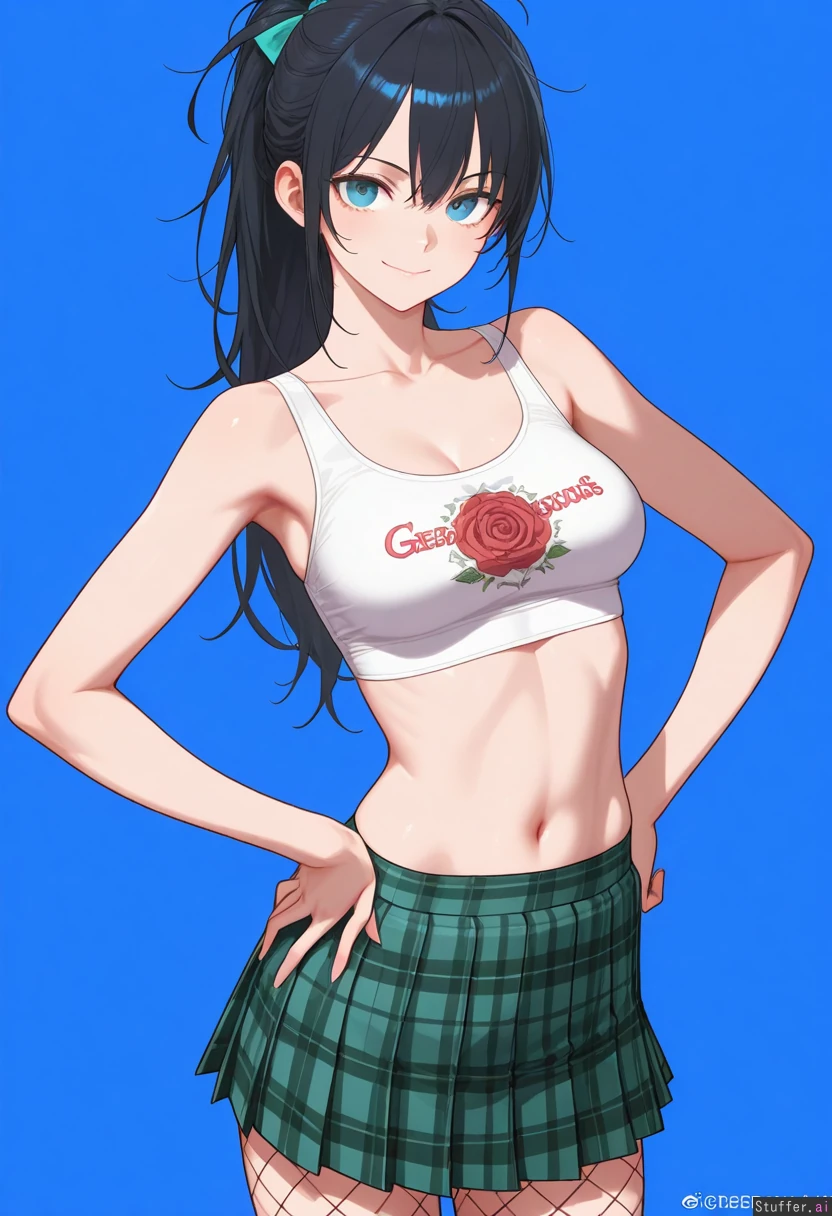 Gorgeous girl. Sexy, detailed face. 8k detail. Exceptional quality. Blue, gorgeous eyes. Long Messy black hair in a messy ponytail. Big, sexy smile. Wearing white, cropped tank top with rose design on front. Wearing green pleated, plaid_skirt. Wearing pink fishnet_pantyhose. skinny body. Hand on hip.
