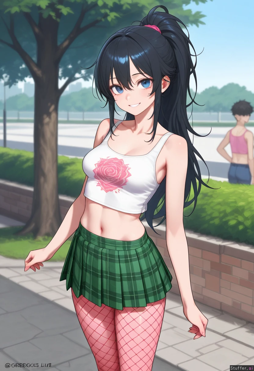 Gorgeous girl. Sexy, detailed face. 8k detail. Exceptional quality. Blue, gorgeous eyes. Long Messy black hair in a messy ponytail. Big, sexy smile. Wearing white, cropped tank top with rose design on front. Wearing green pleated, plaid_skirt. Wearing pink fishnet_pantyhose. Standing in park. skinny body.